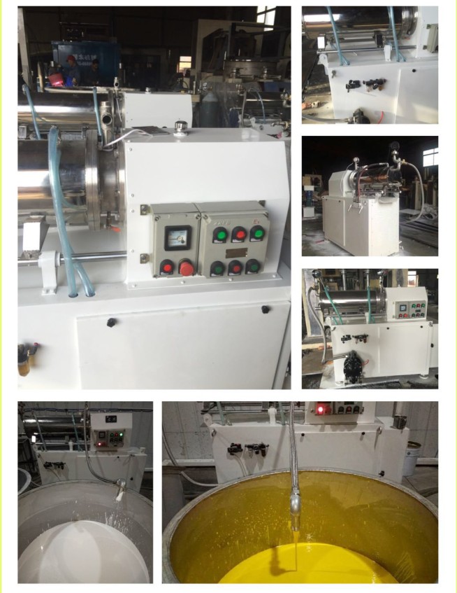 是利用料泵將經過攪拌機預分散潤濕處理后的固-液相混合物料輸入筒體內,物料和筒體內的研磨介質一起被高速旋轉的分散器攪動,從而使物料中的固體 微粒和研磨介質相互間產生更加強烈的碰撞、摩擦、剪切作用,達到加快磨細微粒和分散聚集體的目的。研磨分散后的物料經過動態分離器分離研磨介質,從出料管流出。臥式砂磨機特別適合分散研磨粘度高而粒度要求細的產品。